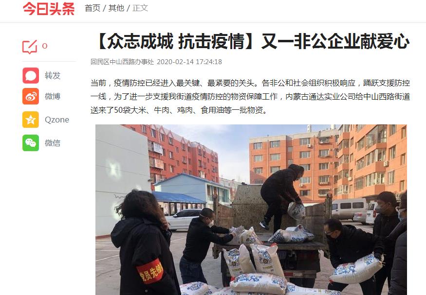 在新型冠狀病毒肺炎疫情肆虐神州大地之時,在這個特殊的時期里,每個人都卷入了一場特殊的戰(zhàn)役。在疫情當(dāng)前我們看到一批批勇敢的逆行者夜以繼日的堅守在一線崗位,保障著你我健康安全,守護者大家的生活秩序。內(nèi)蒙古通達實業(yè)股份有限公司強化責(zé)任擔(dān)當(dāng)、積極響應(yīng)、迅速行動,在做好各項防控措施的同時出資20萬元善款,通過全市多個轄區(qū)內(nèi)的街道辦事處進行愛心物資捐贈活動,以表達通達公司對奮戰(zhàn)在疫情聯(lián)防聯(lián)控一線的工作人員最崇高的敬意!
